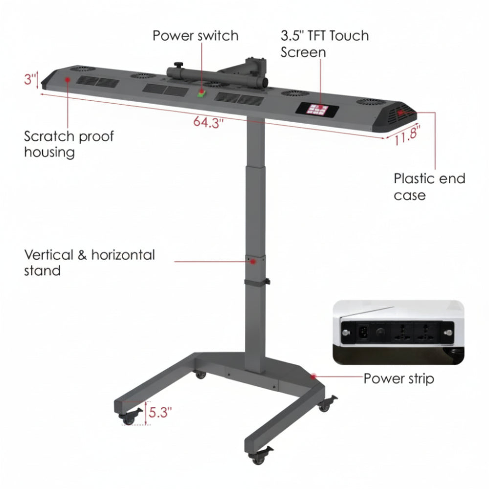 The Total Spectrum ULTRA (7 Wave 480 LEDs) is a premium, full-body red light therapy system engineered for powerful results, ease of use, and long-term safety. Equipped with 480 high-output LEDs and an adjustable electric stand, the ULTRA supports both standing and lying-down treatments for total-body wellness at home. Utilizing 7 extensively researched wavelengths, intelligent controls, and industry-leading irradiance, this advanced system is designed to support skin health, pain relief, recovery, sleep, cognition, mood, and overall rejuvenation—all in one versatile device.
